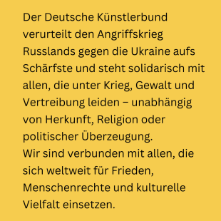 Der Deutsche Künstlerbund verurteilt den von Russland am 24. Februar 2022 begonnenen Angriffskrieg gegen die Ukraine aufs Schärfste. Wir stehen in Solidarität mit den Menschen in der Ukraine – ebenso mit allen anderen, die unter Gewalt, Vertreibung und Zerstörung leiden.