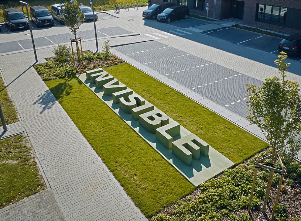 Auf der Rasenfläche vor dem Eingang des Hauptzollamtes ist das Wort INVISIBLE in grün durchgefärbten Betonbuchstaben installiert. Inhaltlich bezieht sich das Wort auf die Themenfelder des Zollamtes. Formal hat die Installation ein absurdes Element, da durch die Massivität und Dauerhaftigkeit des Materials Beton die Arbeit alles andere als unsichtbar ist.