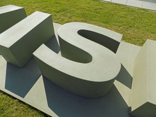 Bodenplatte L 1160 cm x B 178 cm x H 25 cm, Buchstabenbreiten variierend, Sitzhöhe Buchstaben 45 cm